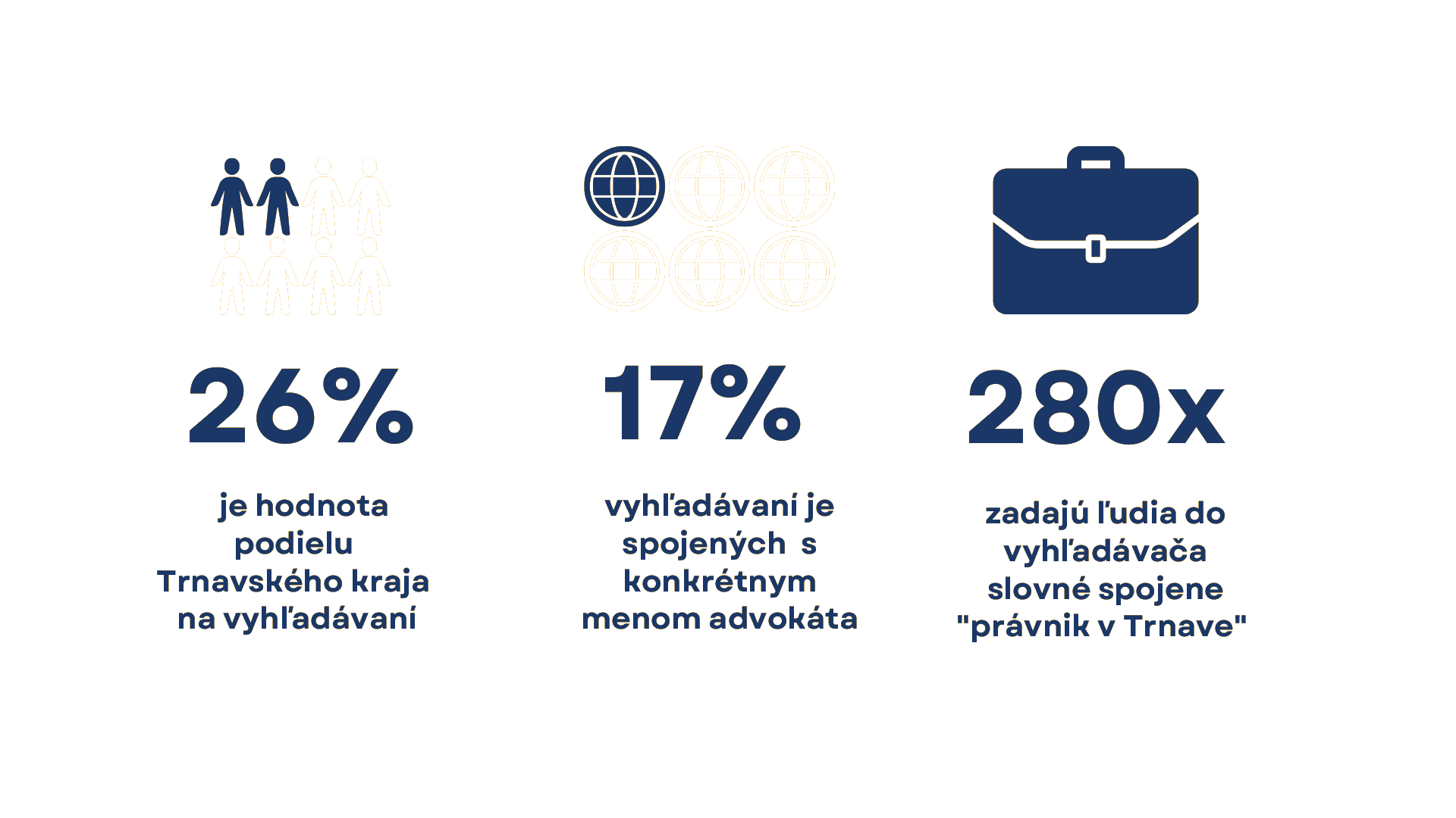 Ak zoberieme pohľad na celú SR tak, Trnavský kraj zastupuje až 26% vyhľadávaní spojených s právnikmi a advokátmi v celej Slovenskej republike. Toto je významný podiel, ktorý naznačuje silný dopyt po právnych službách v kraji, a môže predstavovať príležitosti pre právnické firmy a advokátov, ktorí tu pôsobia. V rámci trnavského kraja ľudia najčastejšie hľadajú právnik v Trnave (viac ako 280x mesačne). Druhým mestom v poradí je Hlohovec, nasleduje Dunajská Streda, a potom Galanta. Treba ale zdôrazniť, že nie vždy keď ľudia zadávajú do vyhľadávača slovo právnik, advokát, aj skutočne hľadajú advokáta. Napríklad v Trnave sa nachádza reštaurácia ktorá má v názve slovo “… u Právnika“, čo spôsobuje, že ľudia cez kľúčové slová právnik Trnava, vyhľadávajú napr. denné menu. Taktiež ľudia zadávajú často dopyty spojené s filmami ako napríklad "advokat csfd", "advokat film netflix", "advoca at drink" a podobné dopyty, na ktoré sa v prípade nesprávneho nastavenia reklama zobrazí, a ktoré vám budú míňať peniaze učené na reklamu. Nie vždy sa tomu ale dá úplne vyhnúť.